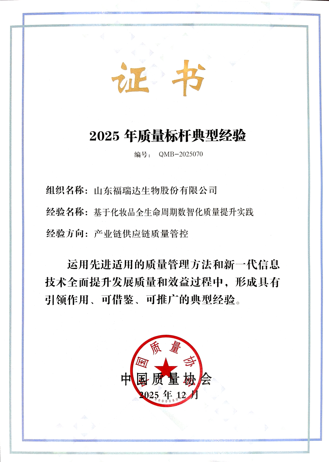 為助力培育產(chǎn)品卓越、品牌卓著、創(chuàng)新領(lǐng)先、治理現(xiàn)代的世界一流企業(yè),2025年中國質(zhì)量協(xié)會(huì)持續(xù)開展質(zhì)量標(biāo)桿典型經(jīng)驗(yàn)征集與交流活動(dòng)。活動(dòng)嚴(yán)格遵循《質(zhì)量標(biāo)桿典型經(jīng)驗(yàn)征集管理辦法》,經(jīng)過多輪嚴(yán)格篩選,最終從質(zhì)量管理數(shù)字化、質(zhì)量管理模式變革、質(zhì)量管理推進(jìn)機(jī)制建立、產(chǎn)業(yè)鏈供應(yīng)鏈質(zhì)量管控等多個(gè)關(guān)鍵領(lǐng)域,評選出74項(xiàng)具有示范引領(lǐng)作用的典型經(jīng)驗(yàn),福瑞達(dá)生物股份的實(shí)踐經(jīng)驗(yàn)在產(chǎn)業(yè)鏈供應(yīng)鏈質(zhì)量管控方向脫穎而出。