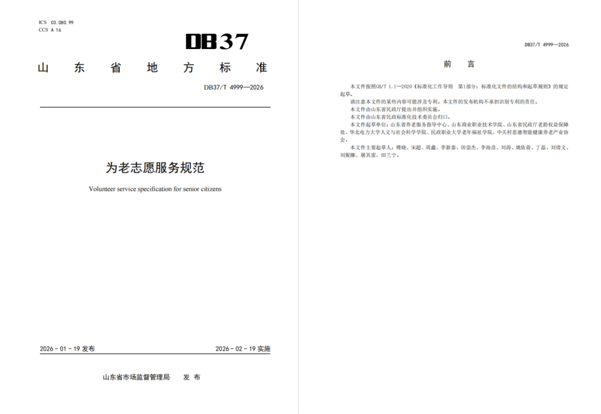 近日,由山東商職學院參與制定的《為老志愿服務規(guī)范》《特殊困難老年人探訪關愛服務規(guī)范》兩項山東省地方標準獲批發(fā)布。